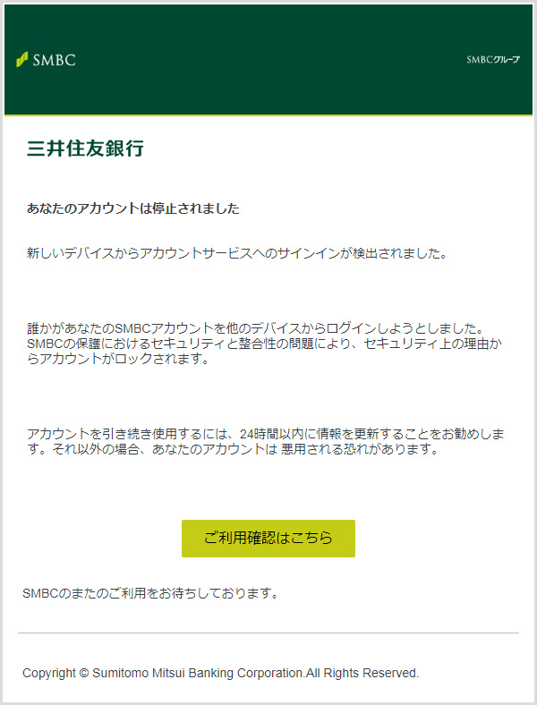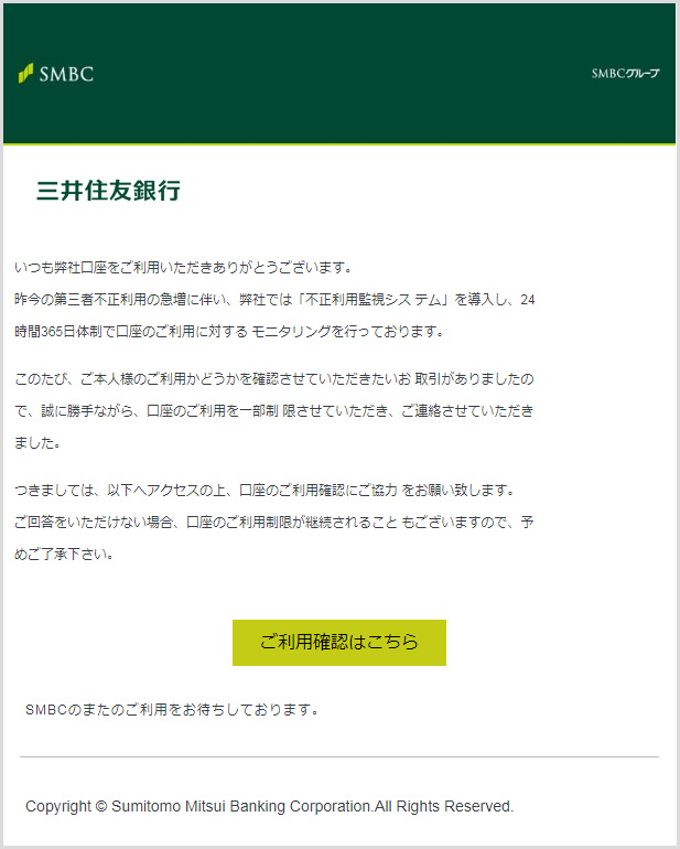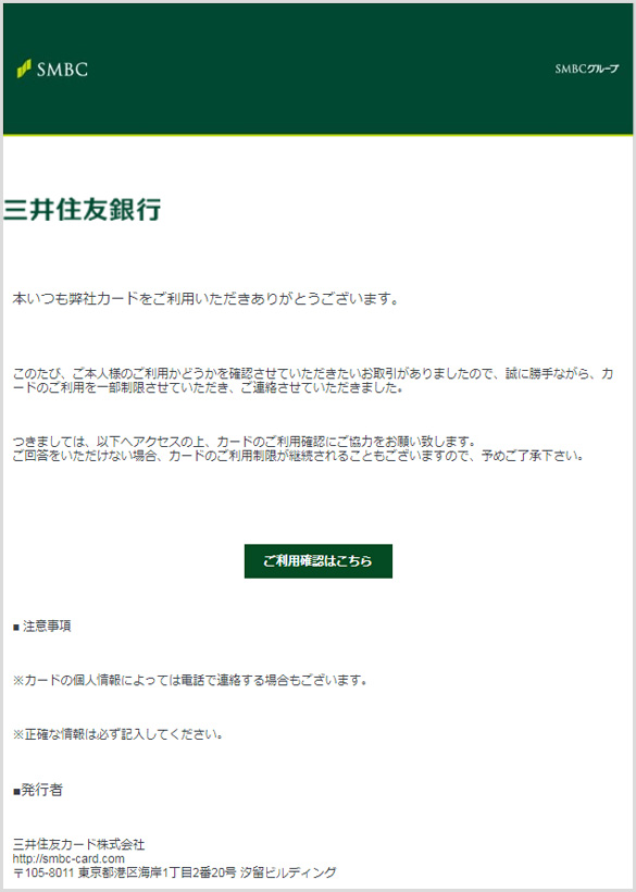 (差出人:三井住友銀行 <SMBC_service@dn.smbc.co.jp>) - 【三井住友カード】ご利用確認のお願い